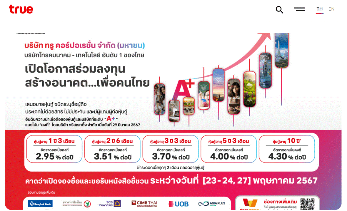 - ตัวอย่าง บริษัท ทรู คอร์ปอเรชั่น จำกัด เสนอขายหุ้นกู้ จ่ายดอกเบี้ยทุก 3 เดือน