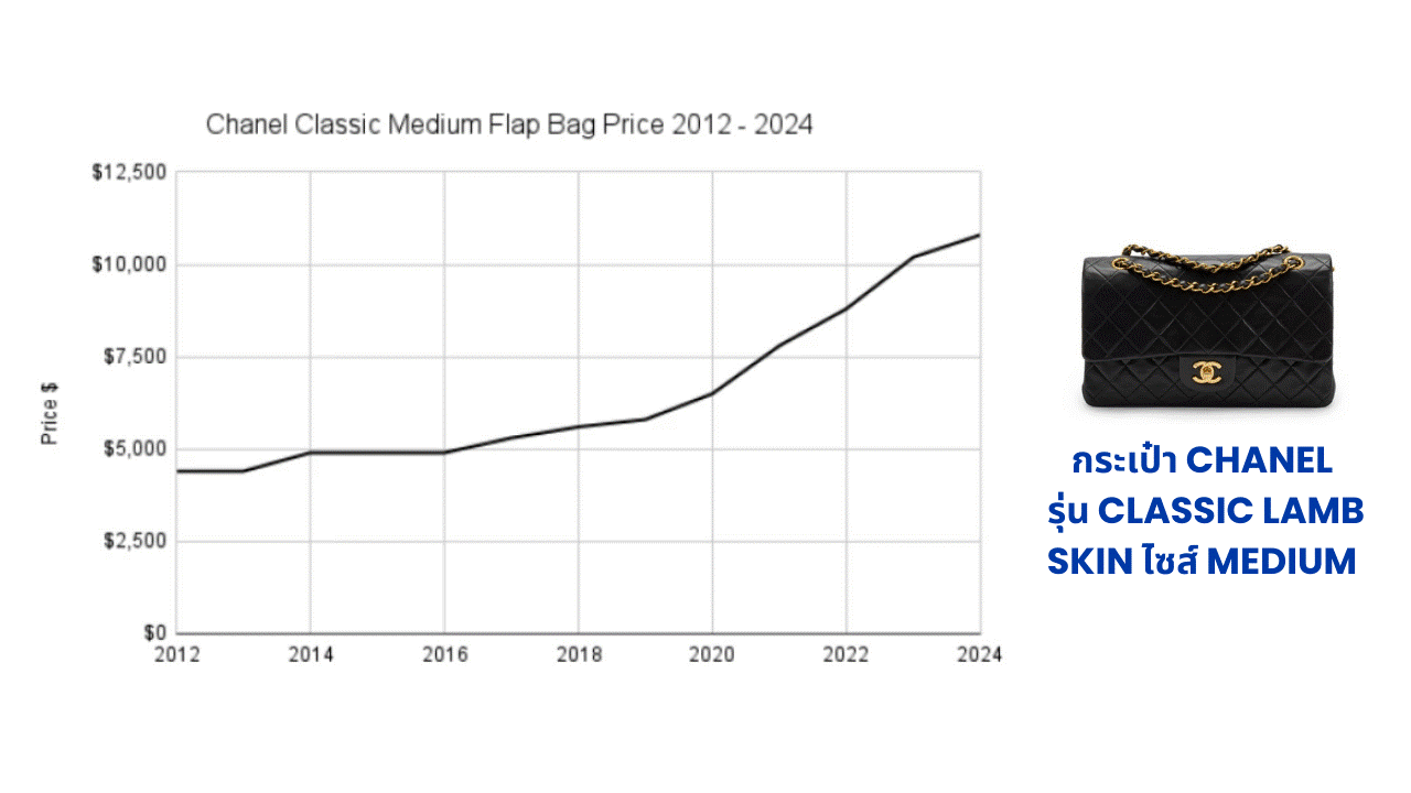 - ในปี 2019 กระเป๋า Chanel รุ่น Classic Lamb Skin ไซส์ Medium มีราคา 5,800 ดอลลาร์ เมื่อเทียบกับปี 2024 ราคากระเป๋าเพิ่มขึ้นมาประมาณ 86% หรือเป็นเงิน 5,000 ดอลลาร์