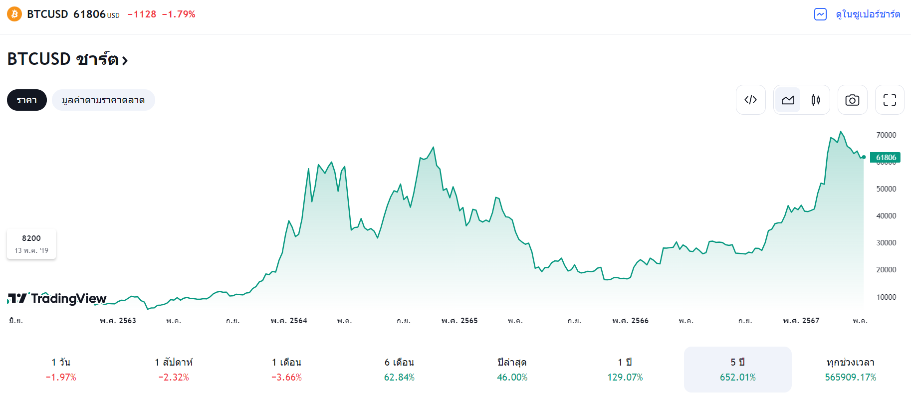 - ในปี 2019 ราคาบิทคอยน์อยู่ที่ประมาณ 8,200 ดอลลาร์ และในปี 2024 บิทคอยน์มีราคาสูงถึง 61,806 ดอลลาร์ มีการเติบโตอย่างรวดเร็วระยะเวลาเพียง 5 ปี ราคาของบิทคอยน์เพิ่มขึ้นถึง 01%