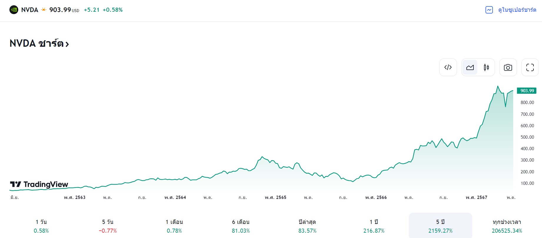 - จากข้อมูลพบว่าการเติบโตของราคาหุ้น NVIDIA ใน 5 ปีย้อนหลังพบว่ามีราคาเพิ่มขึ้นถึง 2,159.27% สามารถสร้างผลตอบแทนได้เฉลี่ยปีละ 85%