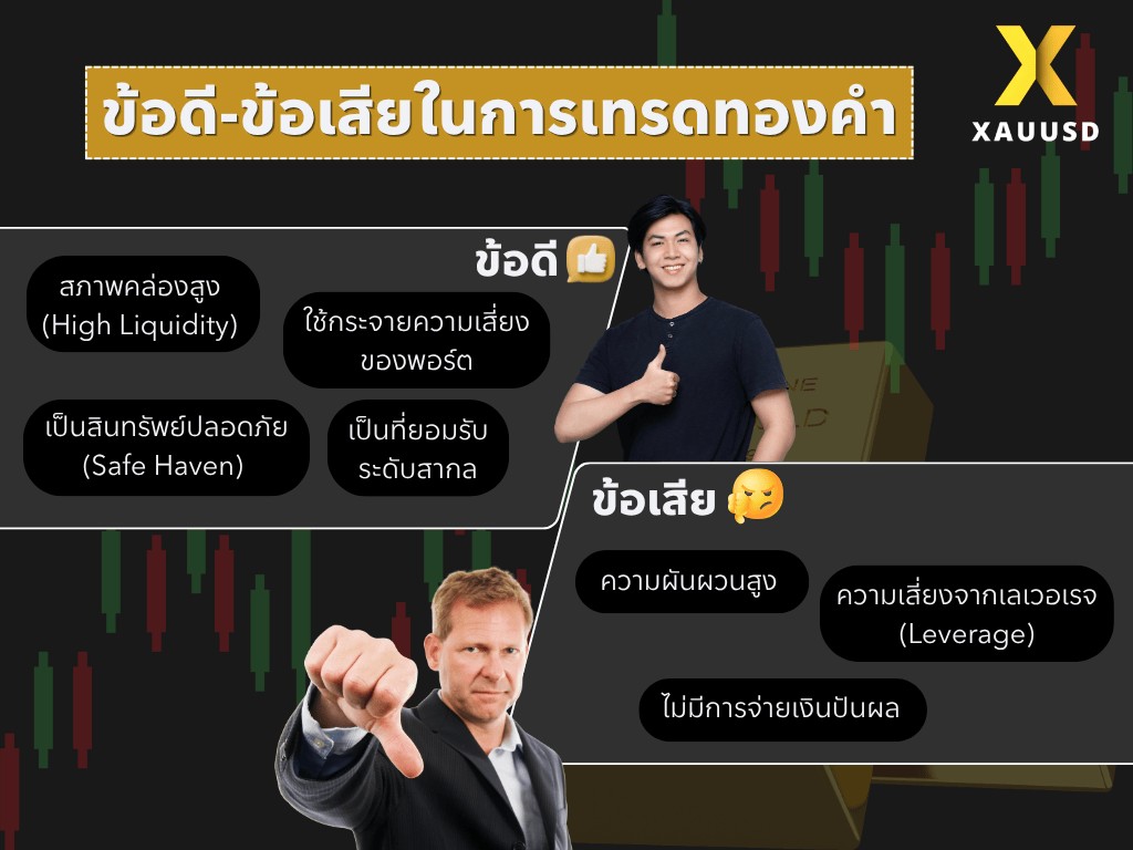 ทีนี้ เรามาดูข้อดี-ข้อเสียในการเทรดทองคำกันบ้าง เพื่อให้เกิดความตระหนักรู้รอบด้านเกี่ยวกับการเทรดทองคำ XAU ครับ