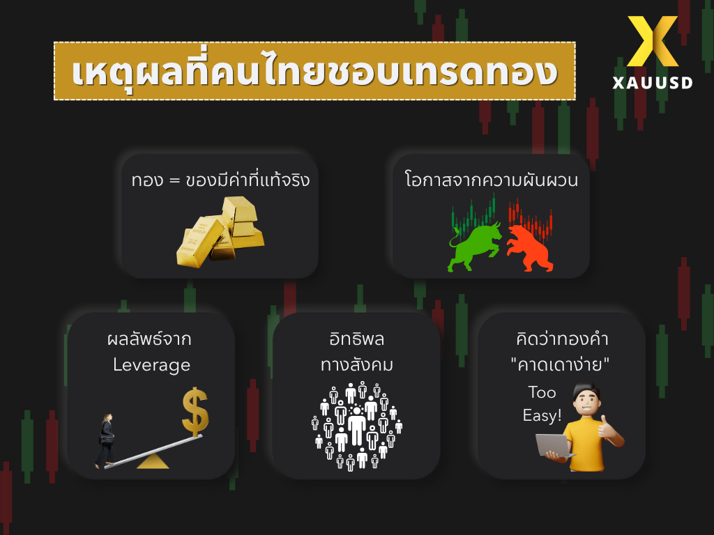 - ปัจจัยหลักที่คนไทยชอบเทรดทองมาจากเหตุผลเชิงจิตวิทยา เช่น ความเชื่อฝังใจว่าทองคือของมีค่า, อิทธิพลทางสังคม (FOMO) และการลุ้นทำกำไรเร็วจาก Leverage